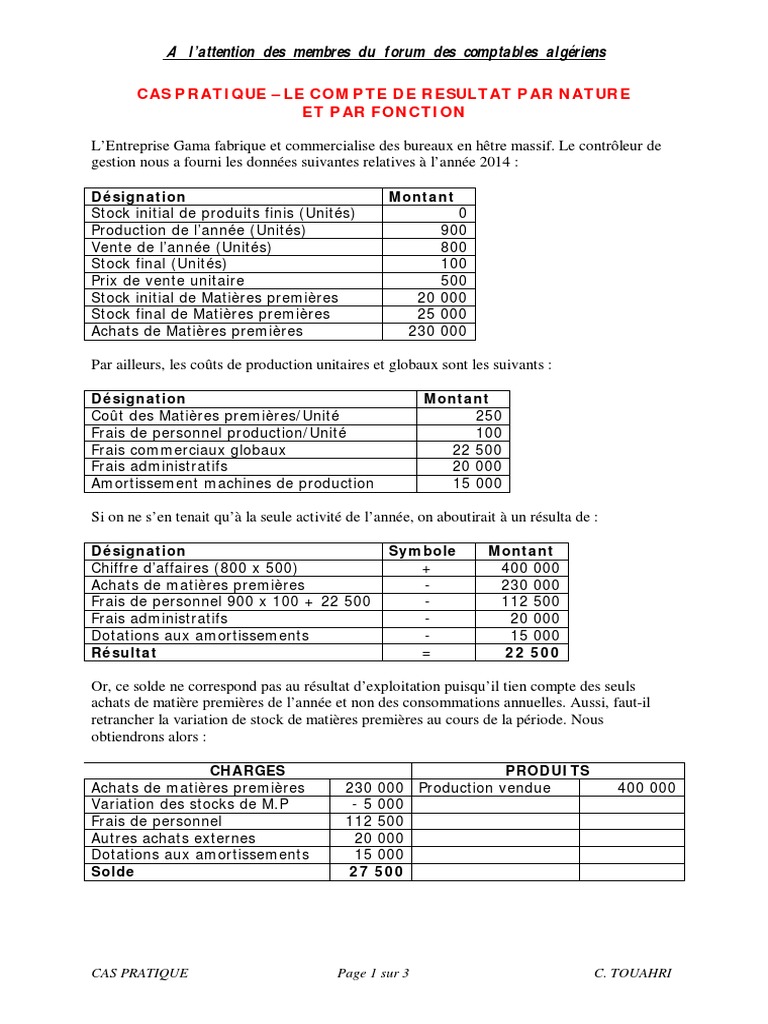 05/04 l'entreprise achète un véhicule de transport pour 75.000 dh dont 5.000 dh payé par chèque bancaire et le reste financé par un emprunt sur 5 ans. +exercice et coriger compte de resultat par nature. Je vous propose ici cinq petits exercices très simples qui permettent de se faire « la main » sur les logiques d'écritures que ce soit pour le bilan ou le compte de résultat. Compte tenu de la pratique et de la nature de l'activite, la presentation du compte de resultat par nature de produits et de charges, jugee.pdf. Onze corrigés d'exercices et de problèmes ne figurent pas dans l'ouvrage mais sont également téléchargeables.
